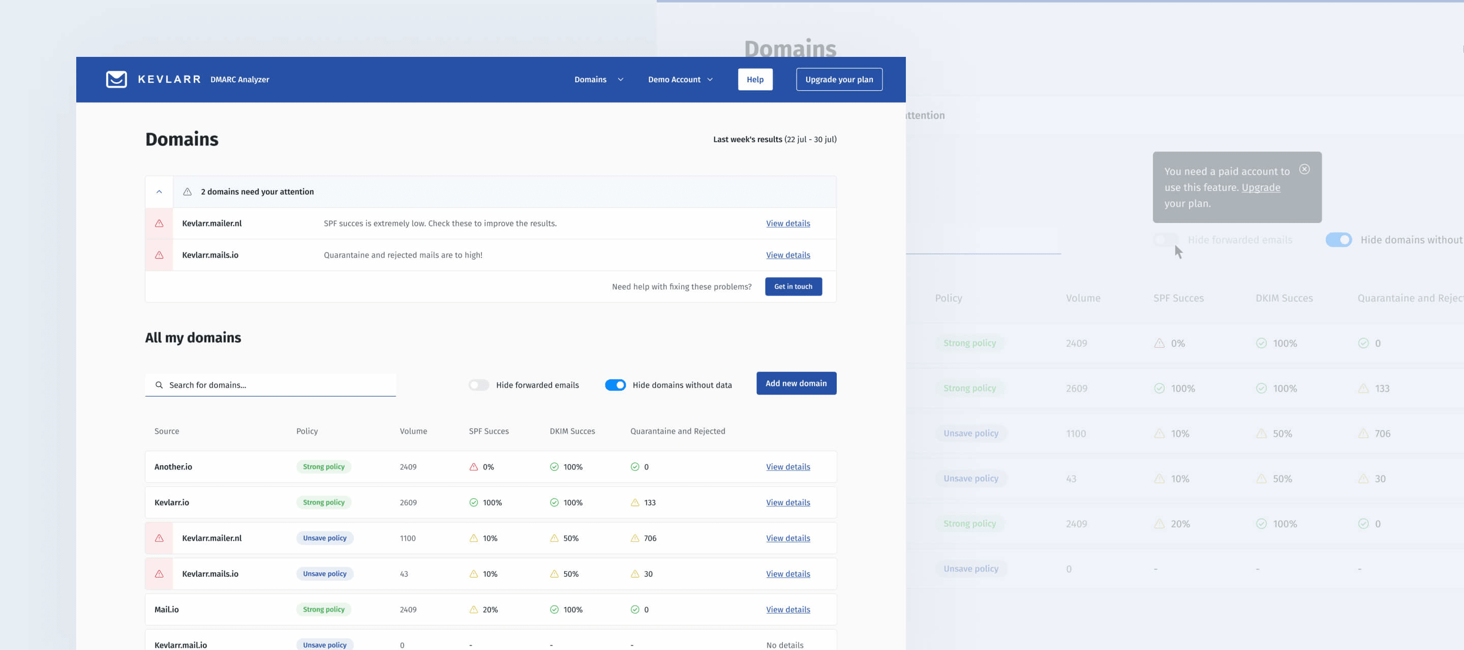 With Kevlarr I am able to protect my customers domain from email spoofing and to improve email deliverability. Without the risk that valid emails got rejected.